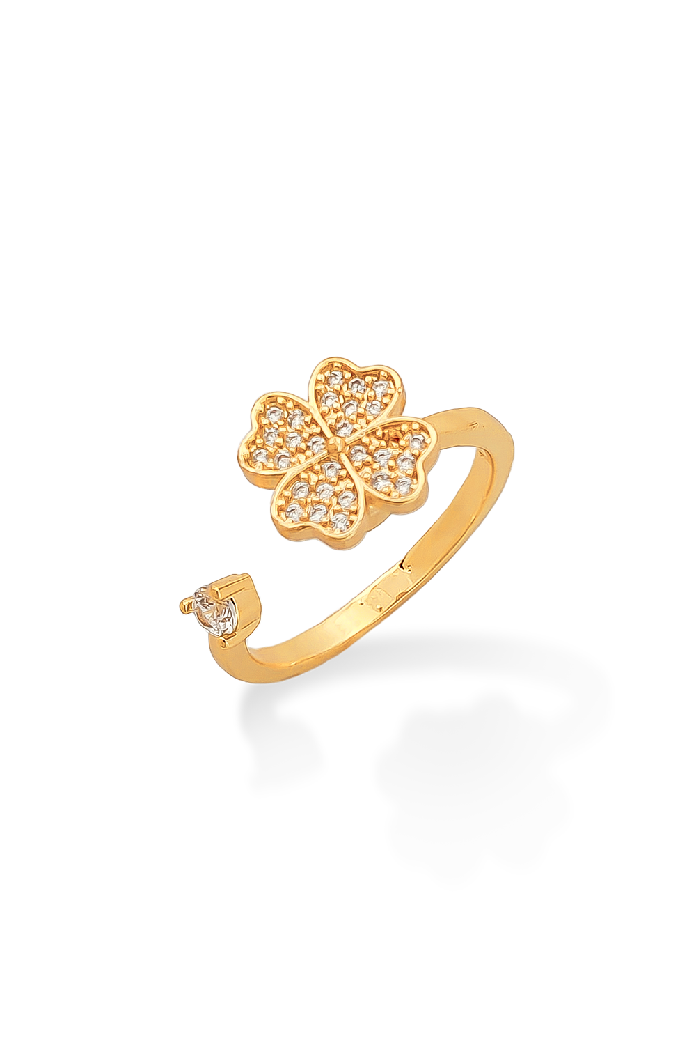 ANILLO AJUSTABLE BAÑADO EN ORO EN FORMA DE TRÉBOL RELLENO DE MICROCIRCONES BLANCOS Y UN CIRCON BLANCO