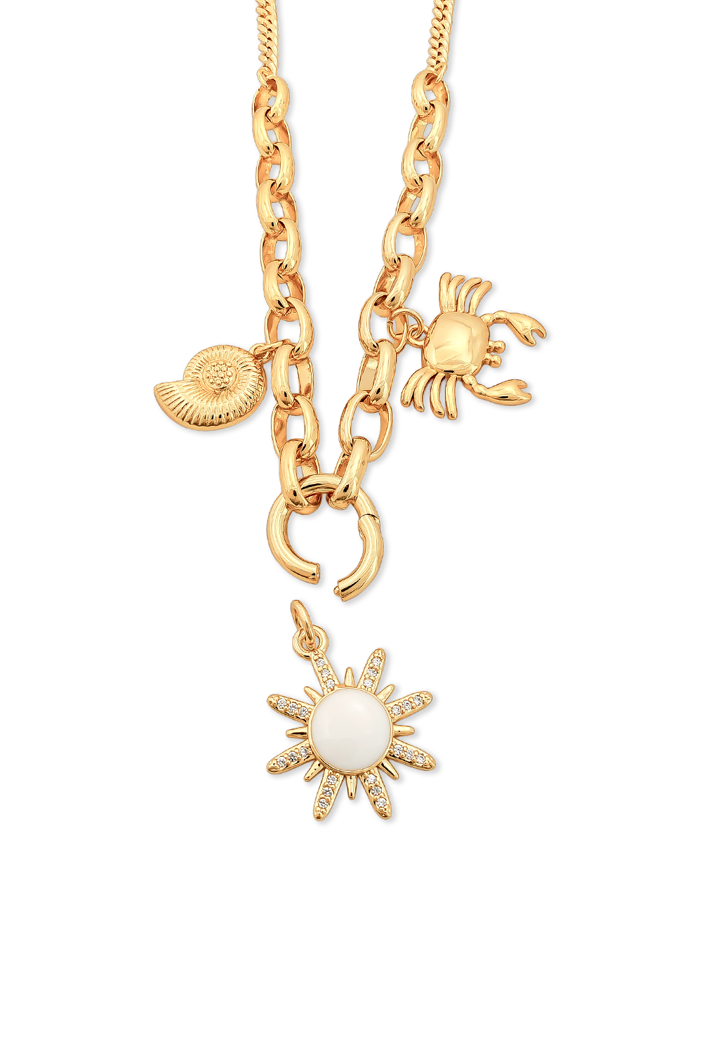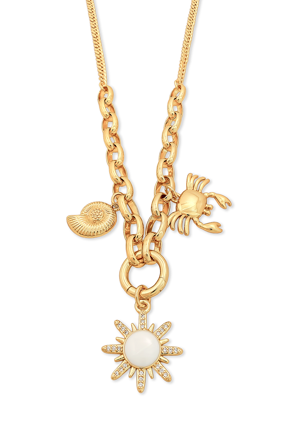 COLLAR BAÑADO EN ORO DE COLECCIÓN MARINA CON FORMA DE SOL , CANGREJO Y CARACOL, EL COLGANTE DEL MEDIO ES REMOVIBLE