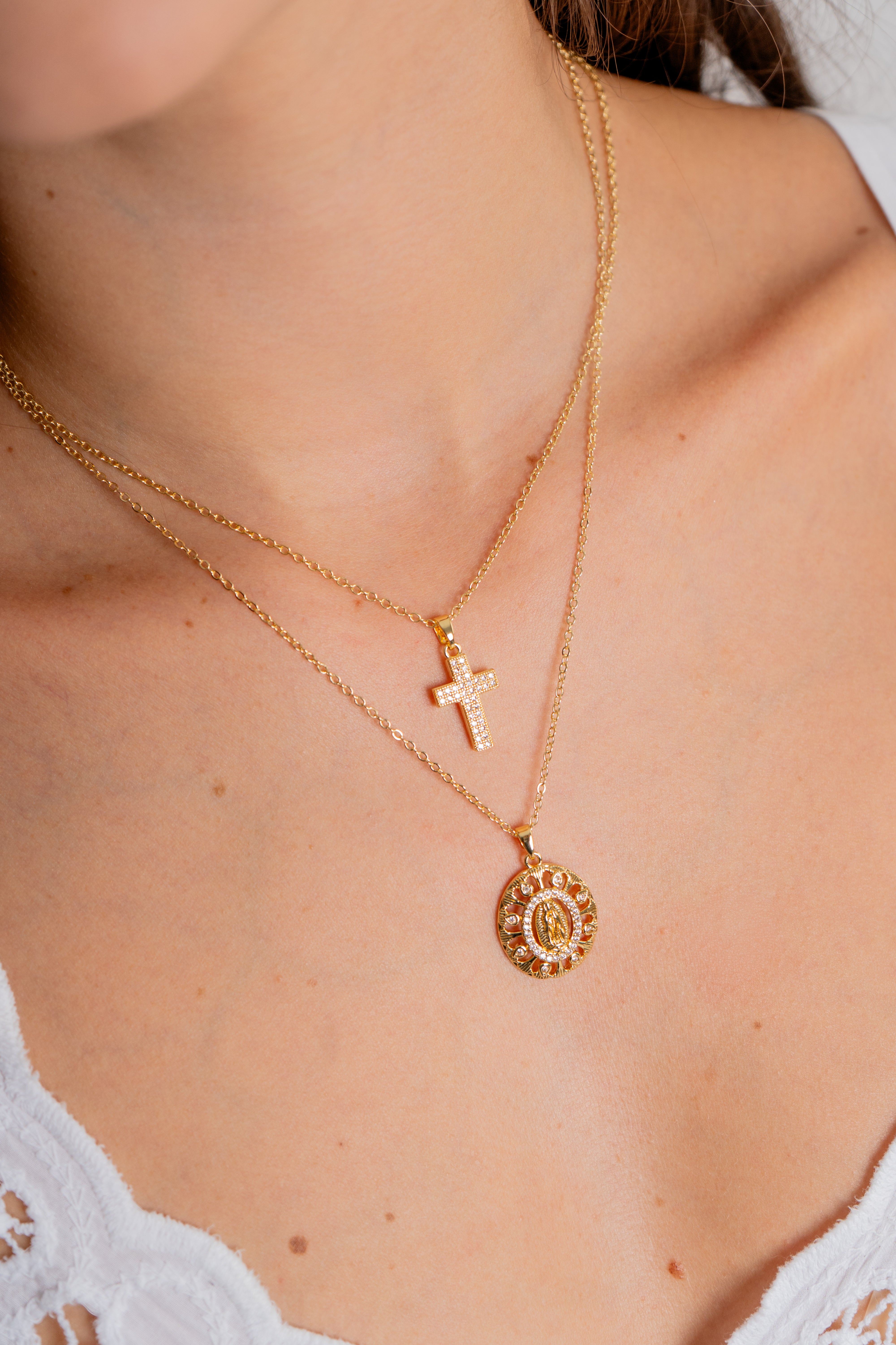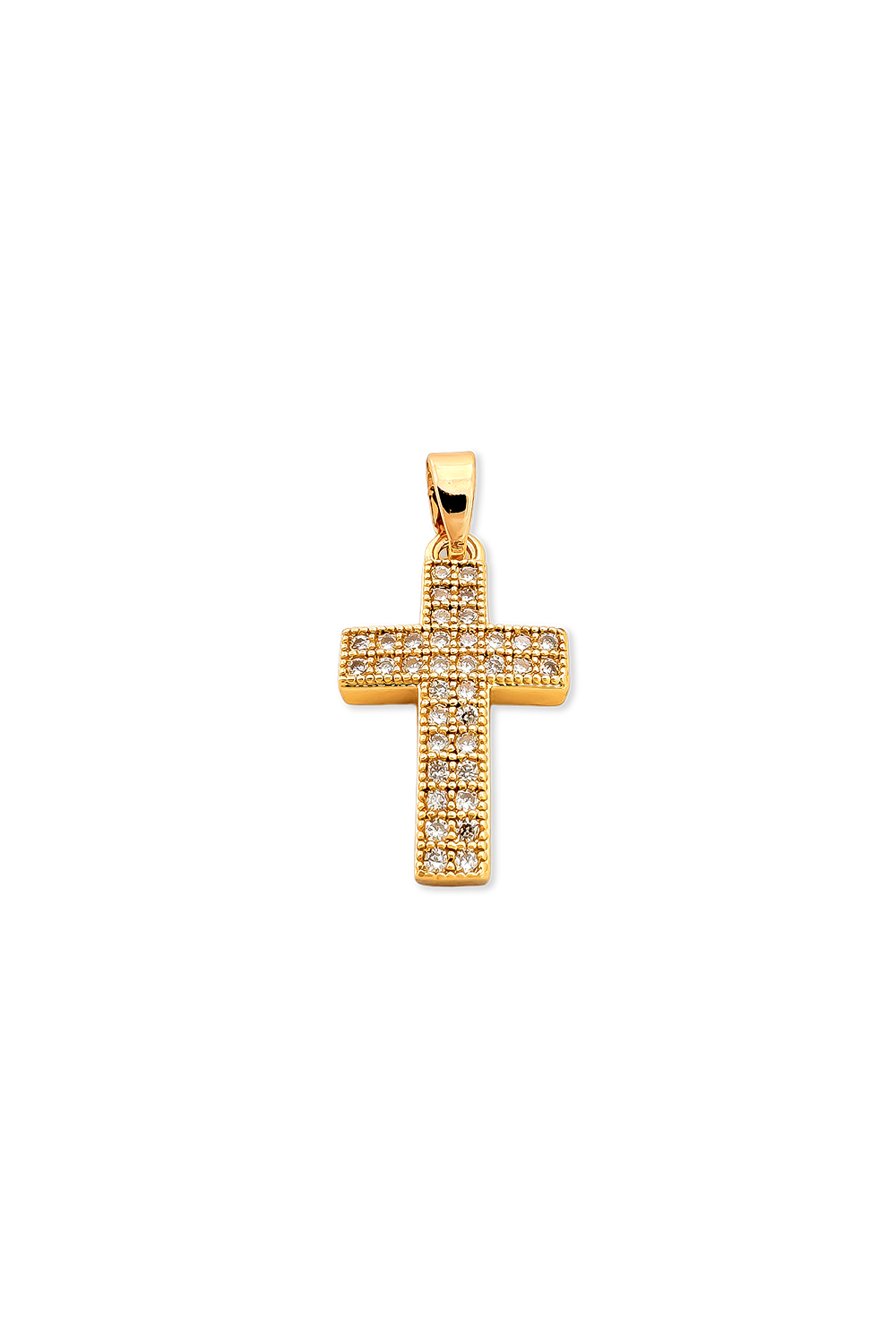 DIJE BAÑADO EN ORO EN FORMA DE CRUZ CON MICROCIRCONES BLANCOS