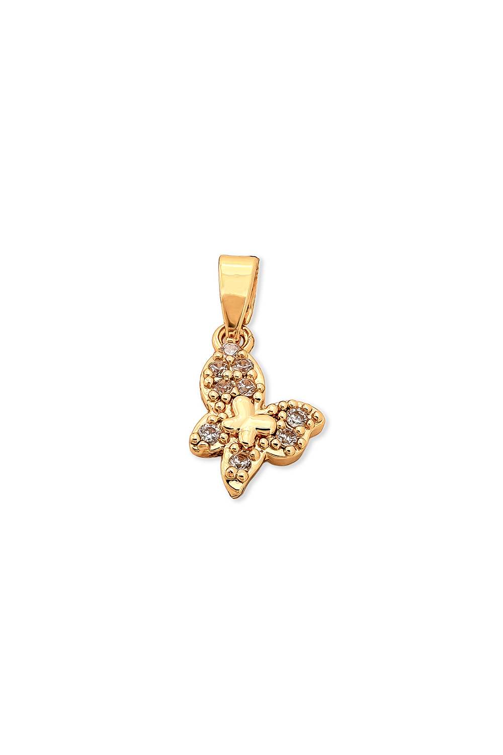 DIJE BAÑADO EN ORO EN FORMA DE MARIPOSA EN TAMAÑO PEQUEÑA Y EN SU INTERIOR MICROCIRCONES BLANCOS