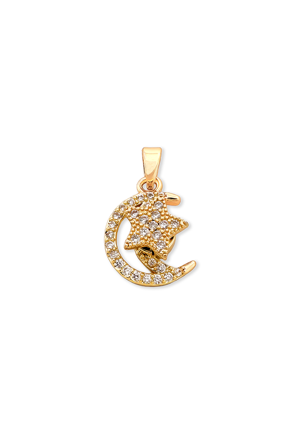 DIJE BAÑADO EN ORO EN FORMA DE LUNA, CON UNA ESTRELLA EN LA MITAD Y MICROCIRCONES BLANCOS