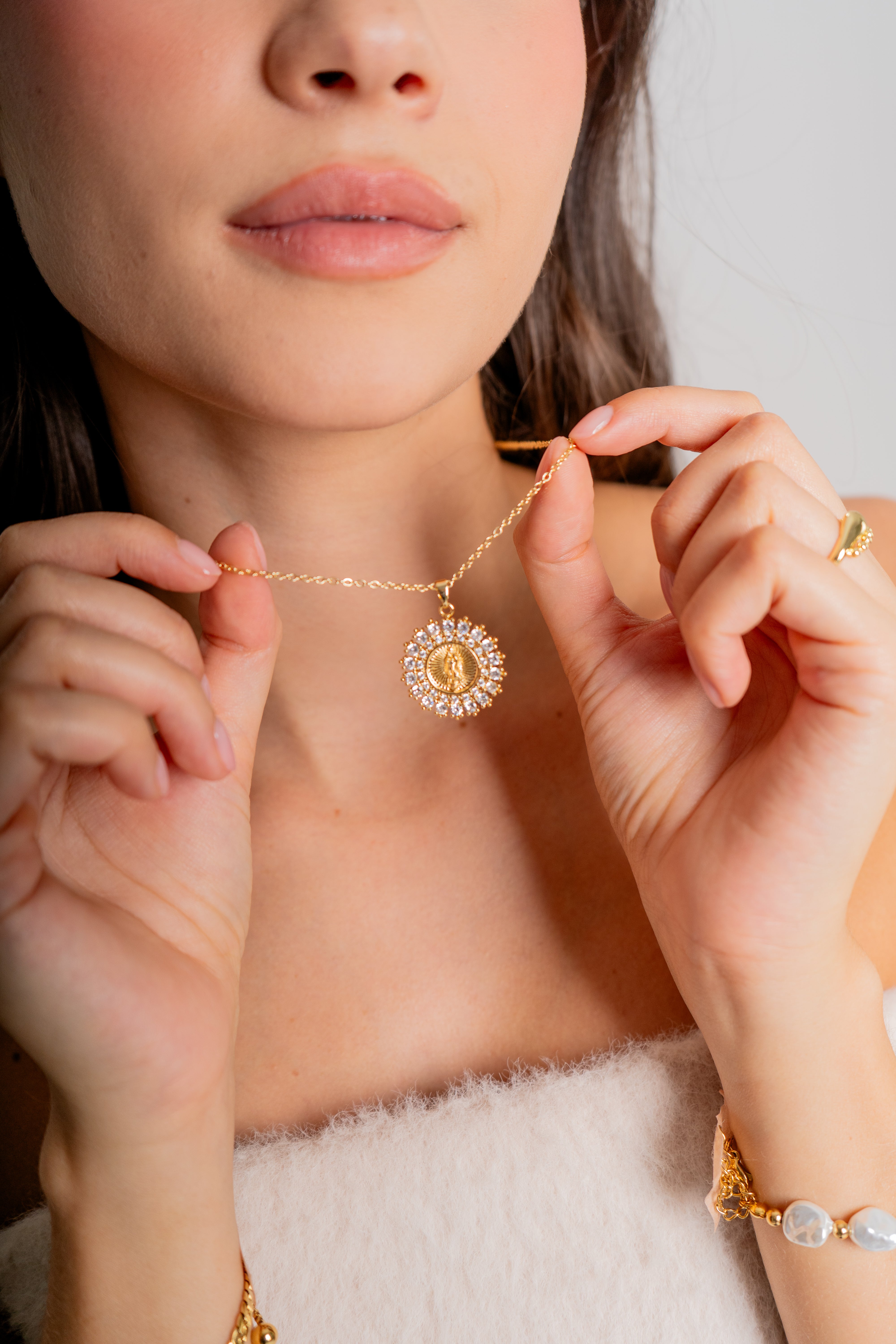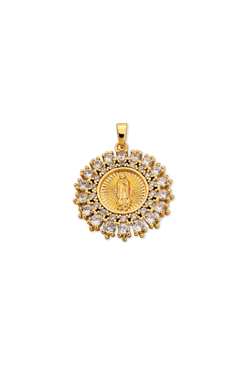 DIJE BAÑADO EN ORO CON FIGURA DE LA VIRGEN DE GUADALUPE Y MICROCIRCONES QUE COMPONEN EL EXTERIOR DEL DIJE