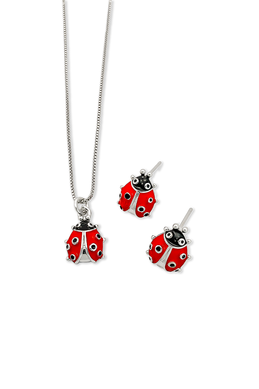 JUEGO CON BAÑO DE PLATA CON TOPOS Y DIJE EN FORMA DE MARIQUITA CON CADENA