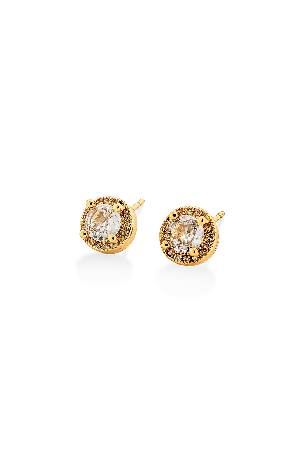 TOPOS BAÑADOS EN ORO EN FORMA CIRCULAR CON UN CIRCON BLANCO EN EL MEDIO Y MICROCIRCONES ALREDEDOR