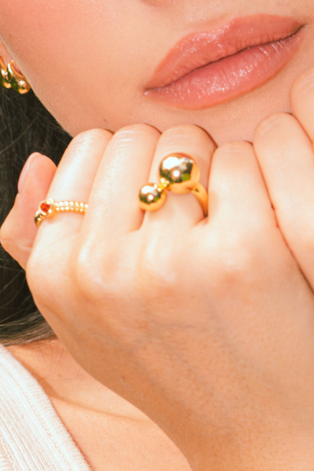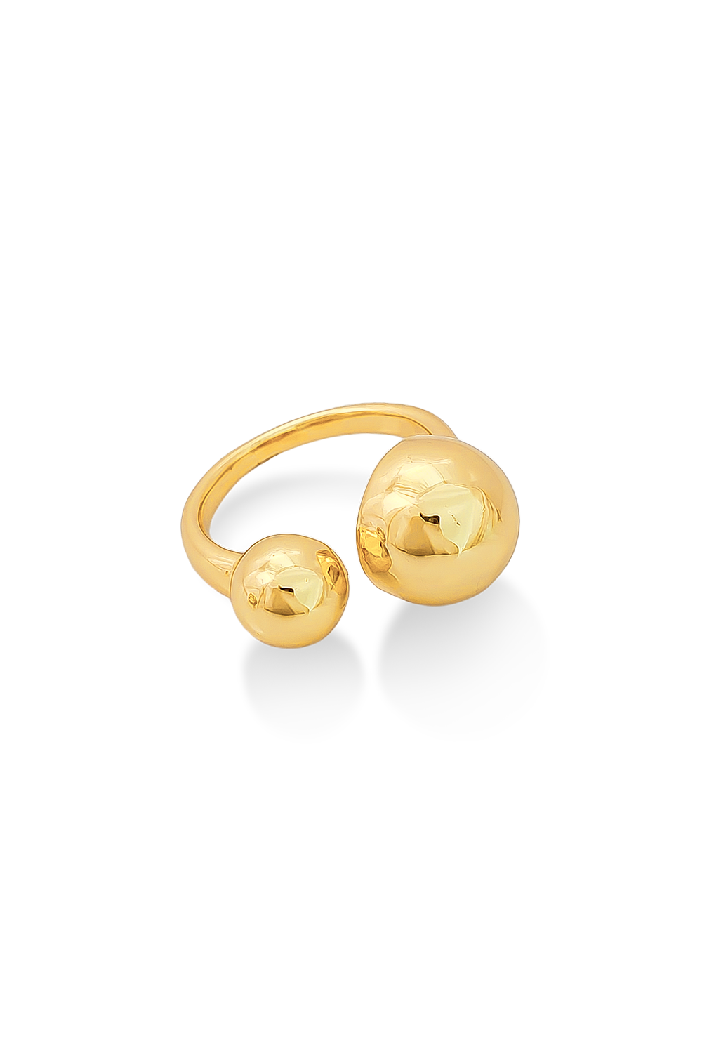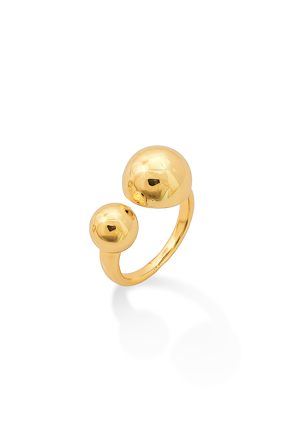 ANILLO AJUSTABLE BAÑADO EN ORO CON DOS BALÍNES, UNO GRANDE Y OTRO PEQUEÑO