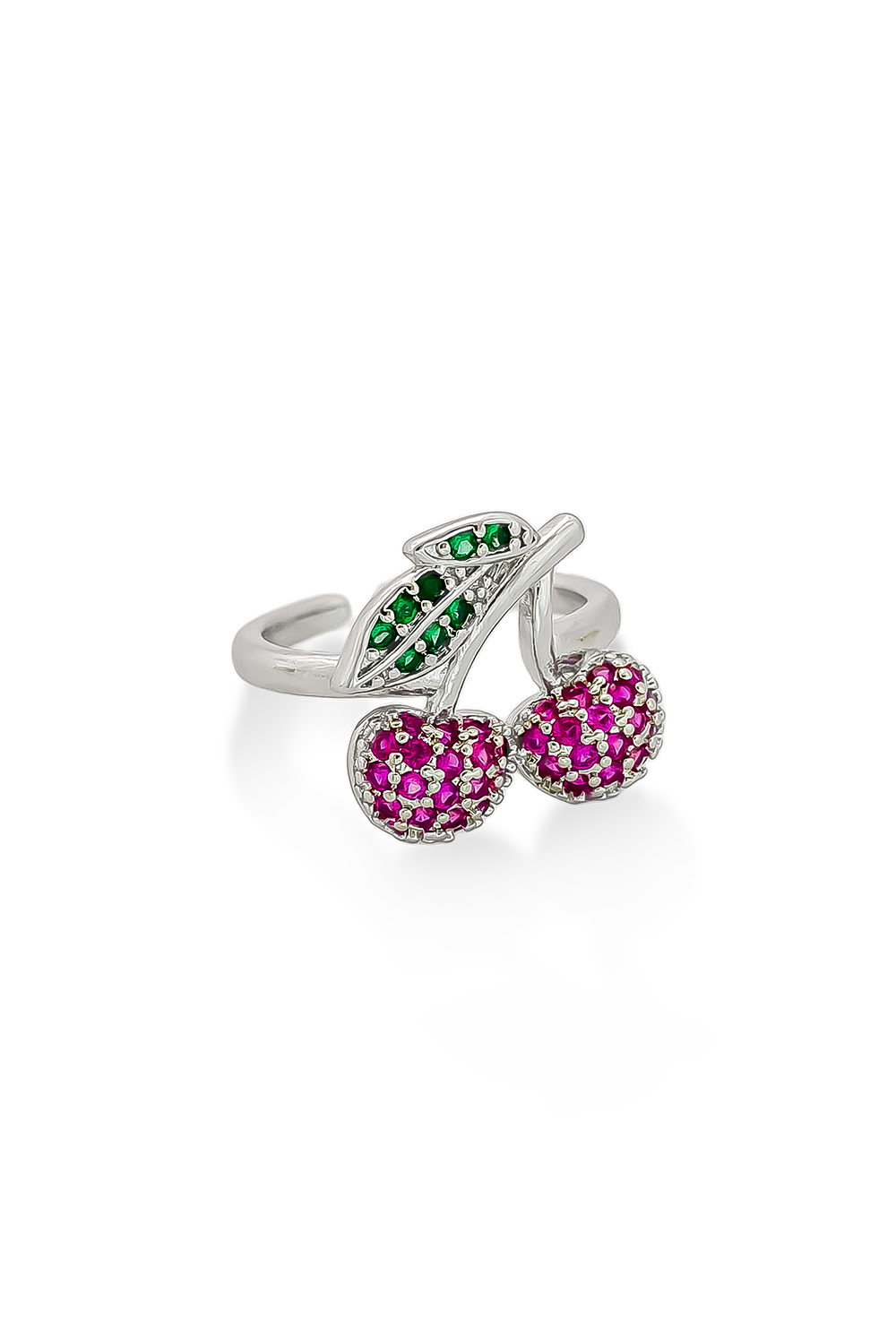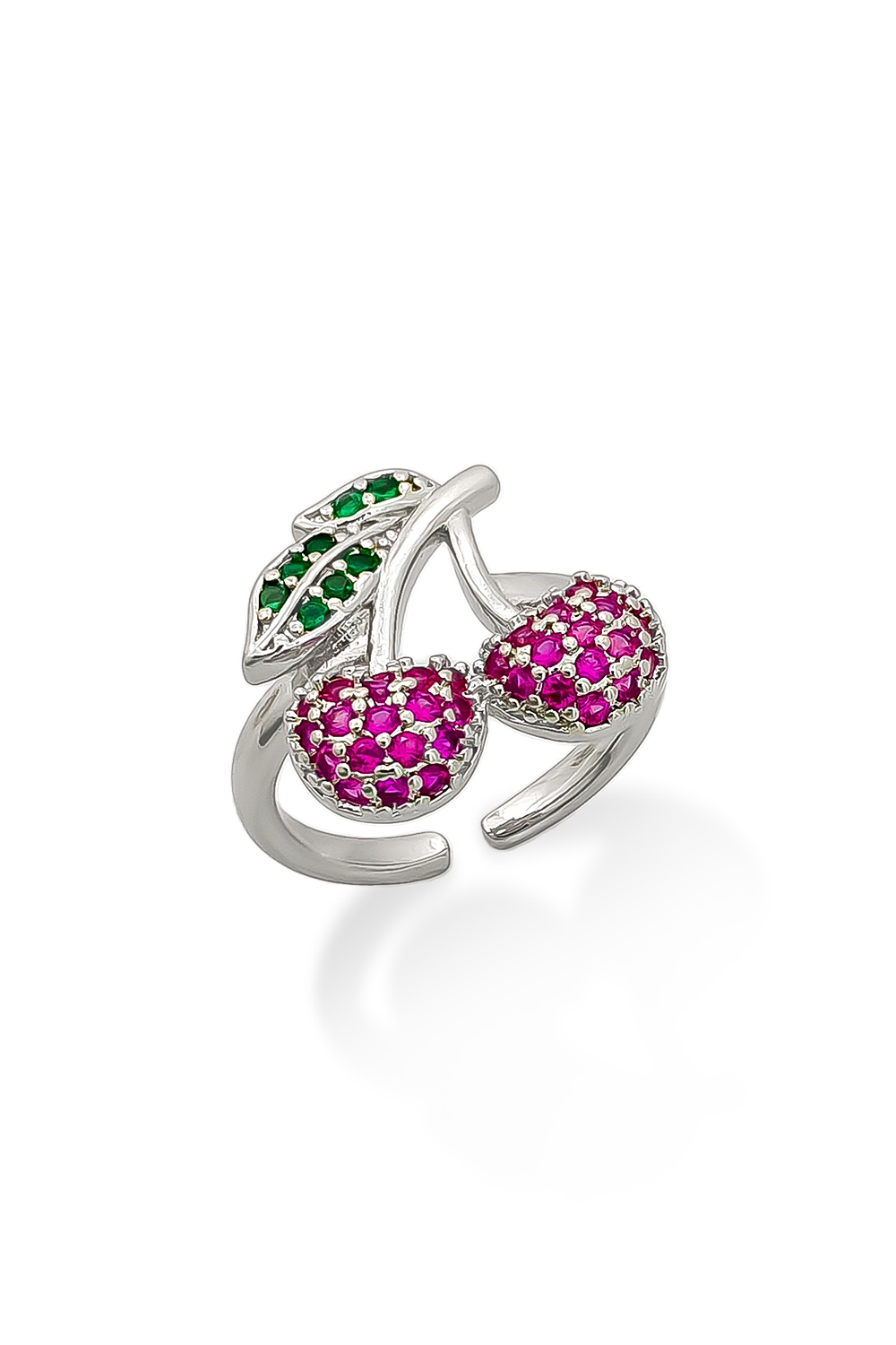 ANILLO AJUSTABLE CON BAÑO DE PLATA EN FORMA DE CEREZA RELLENO DE CIRCONES COLOR ROSADO Y VERDE