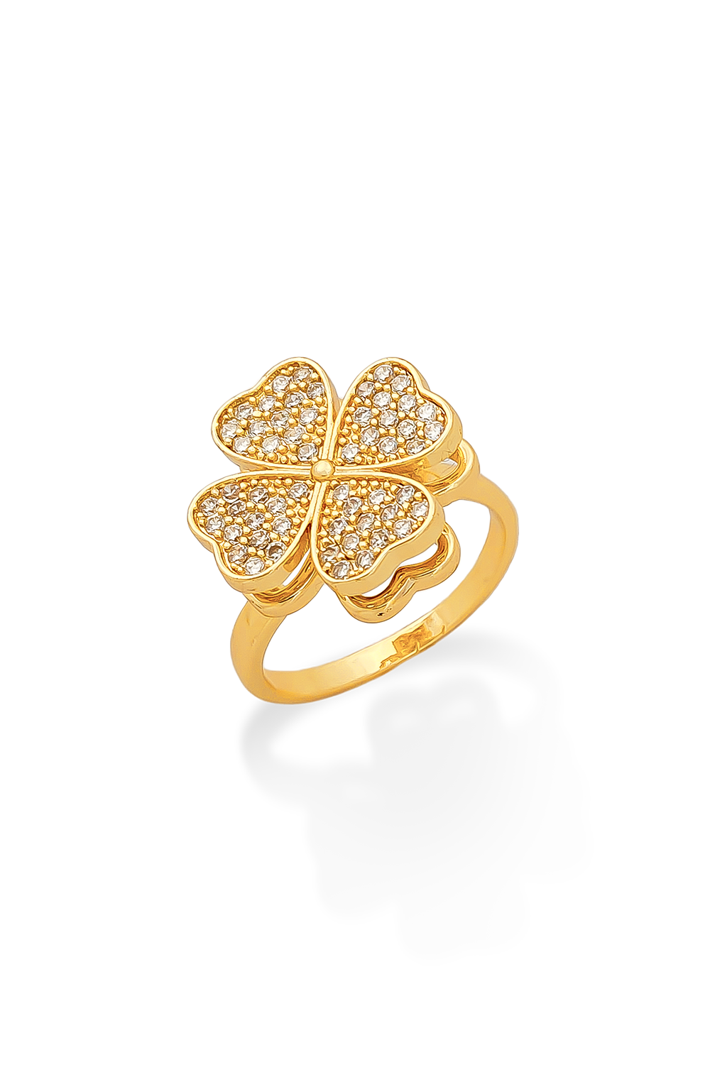 ANILLO BAÑADO EN ORO EN FORMA DE TRÉBOL GIRATORIO RELLENO DE MICROCIRCONES BLANCOS